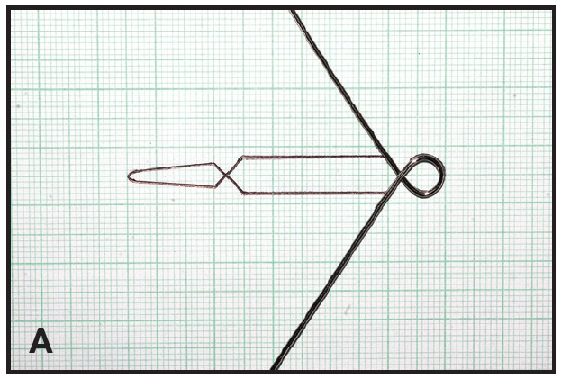 1. Cut a 6-7" length of .9mm or .036" stainless steel wire (A). Using a universal plier, bend a helix about 6mm in diameter at the midpoint of the wire.