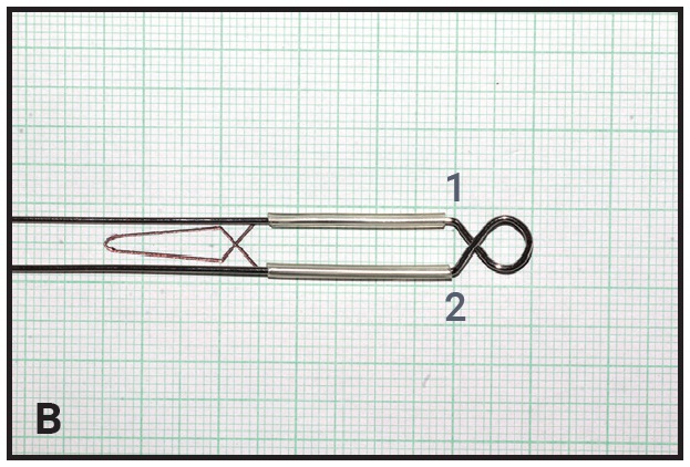 2. Add bends at points 1 and 2 as shown (B), making the two arms parallel to each other. Plastic sleeves can be placed over the arms to improve the grip of the device.