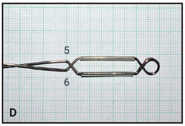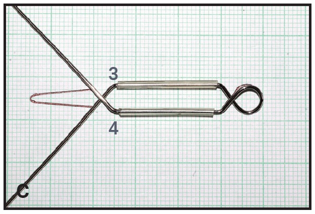 3. Bend the wire at points 3 and 4 (C), so that the arms cross over each other. These bends give the device a reverse-action property.