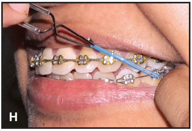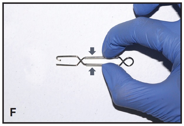 Press the upper and lower arms of the SEAT together (F) to separate the arms for elastic insertion. Place the elastic over the hook, then engage the straight arm around the hook to secure the elastic (G). After intraoral placement of the elastic (H), press the upper and lower arms together again to release the elastic from the SEAT.