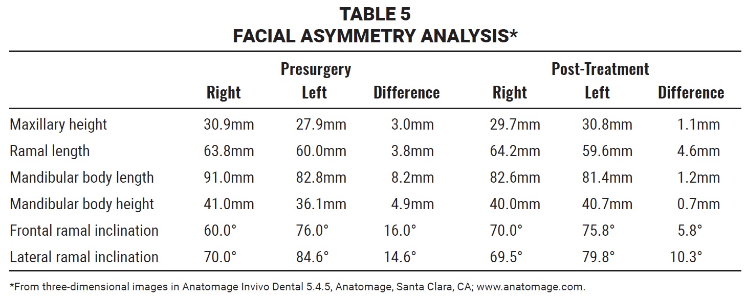 The Ricketts frontal cephalometric analysis indicated skeletal asymmetry of the mandible and dental asymmetry of the mandibular arch (Table 3).