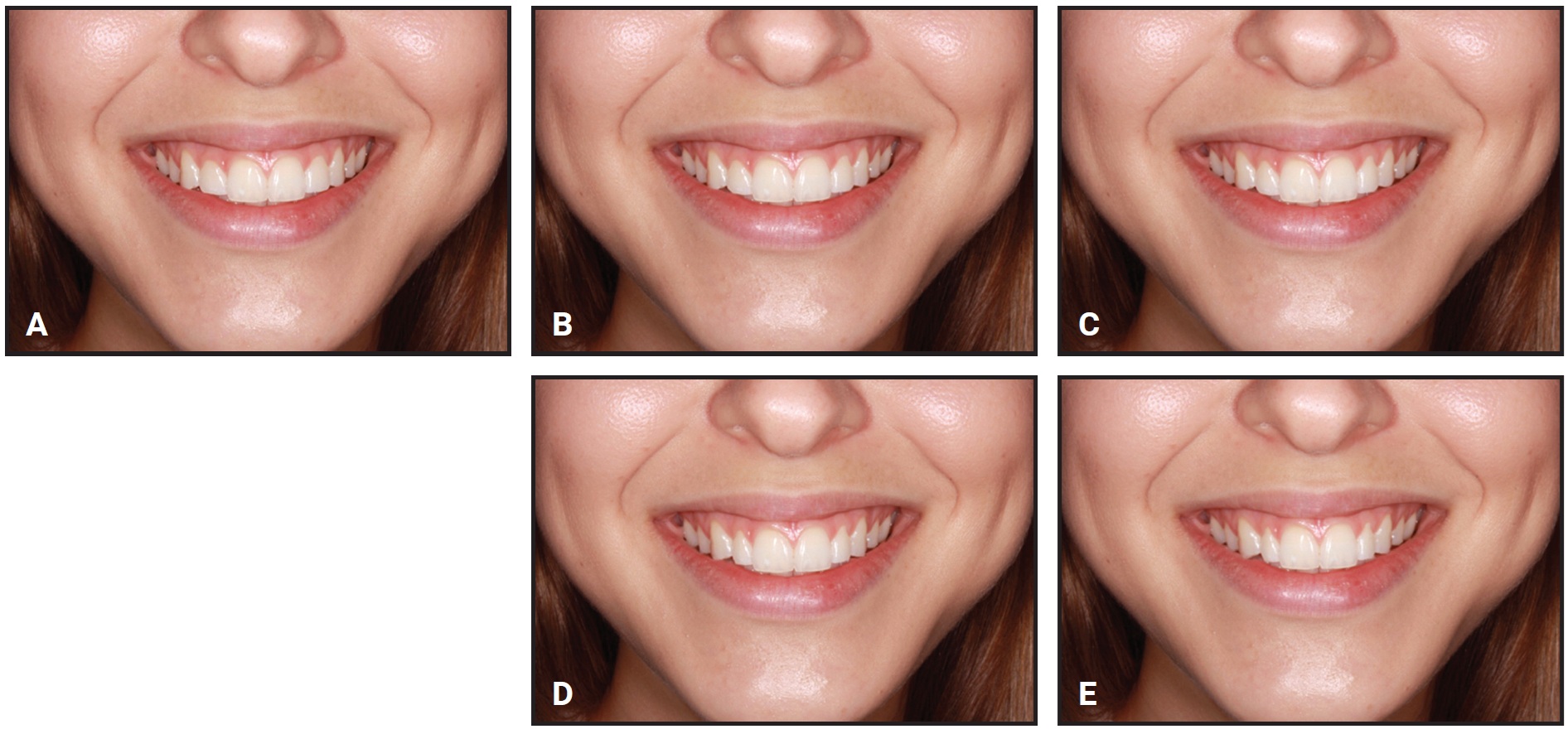 Fig. 2 A. Original smile. B. .5mm bilateral reduction in mesiodistal widths of upper lateral incisors. C. 1mm bilateral reduction. D. 1.5mm bilateral reduction. E. 2mm bilateral reduction.