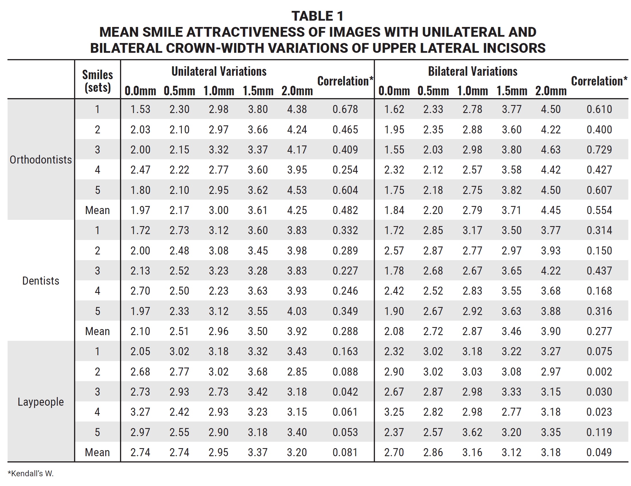 Table 1 shows the smile attractiveness levels as evaluated by the groups of orthodontists, dentists, and laypeople, along with their correlation with the amount of crown-width variation of the upper lateral incisors.
