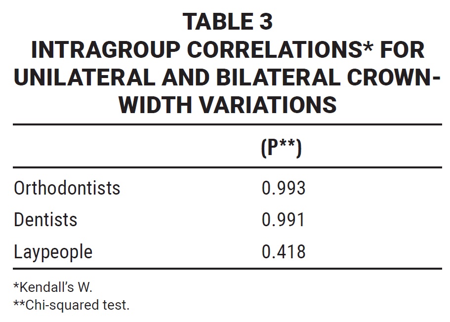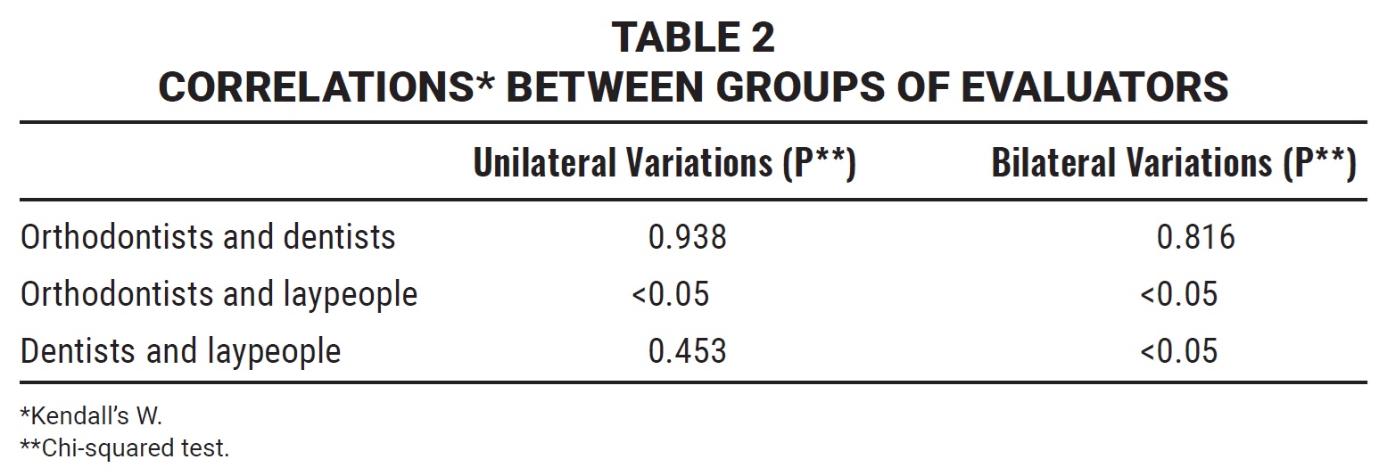 There were statistically significant differences in the unilateral rankings between the groups of orthodontists and laypeople, as well as in the bilateral rankings between the laypeople and both the orthodontists and dentists (Table 2).