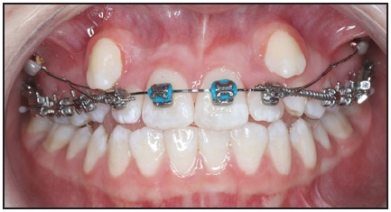 Four weeks later, the lower arch was bonded, twin .014" nickel titanium wires were inserted, and bite turbos were placed on the upper second premolars to control the posterior vertical dimension and avoid disocclusion from the lower brackets (Fig. 3). A power chain was attached from the upper right TAD to the upper right first premolar for buccal segment distalization and from the upper left TAD to the upper left canine (still not engaged with the archwire) for single-tooth distalization. The open-coil springs from the upper lateral incisors to the first premolars were reactivated as needed to open space for the upper canines; closed-coil springs were placed when enough space had been gained.