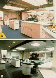 Fig. 5 A. Operatory with four fluorescent fixtures (16 tubes) at 7'6" over each chair. B.After conversion to metal halide lighting.