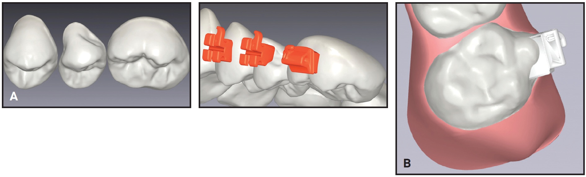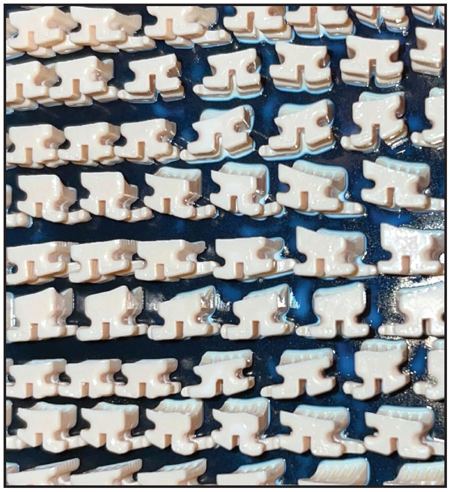 Three-dimensional printing is a well-suited manufacturing technique for fixed appliances because it excels at producing small, complex geometries at scale.5,6 The capability of fabricating digitally designed, 3D-printed brackets with anatomically unique bases and individualized prescriptions marks the beginning of a new generation of customized labial appliances (Fig. 1). The digital ecosystem of 3D printing also empowers clinicians to develop a fully digital workflow and virtual treatment plan for every fixed appliance patient.