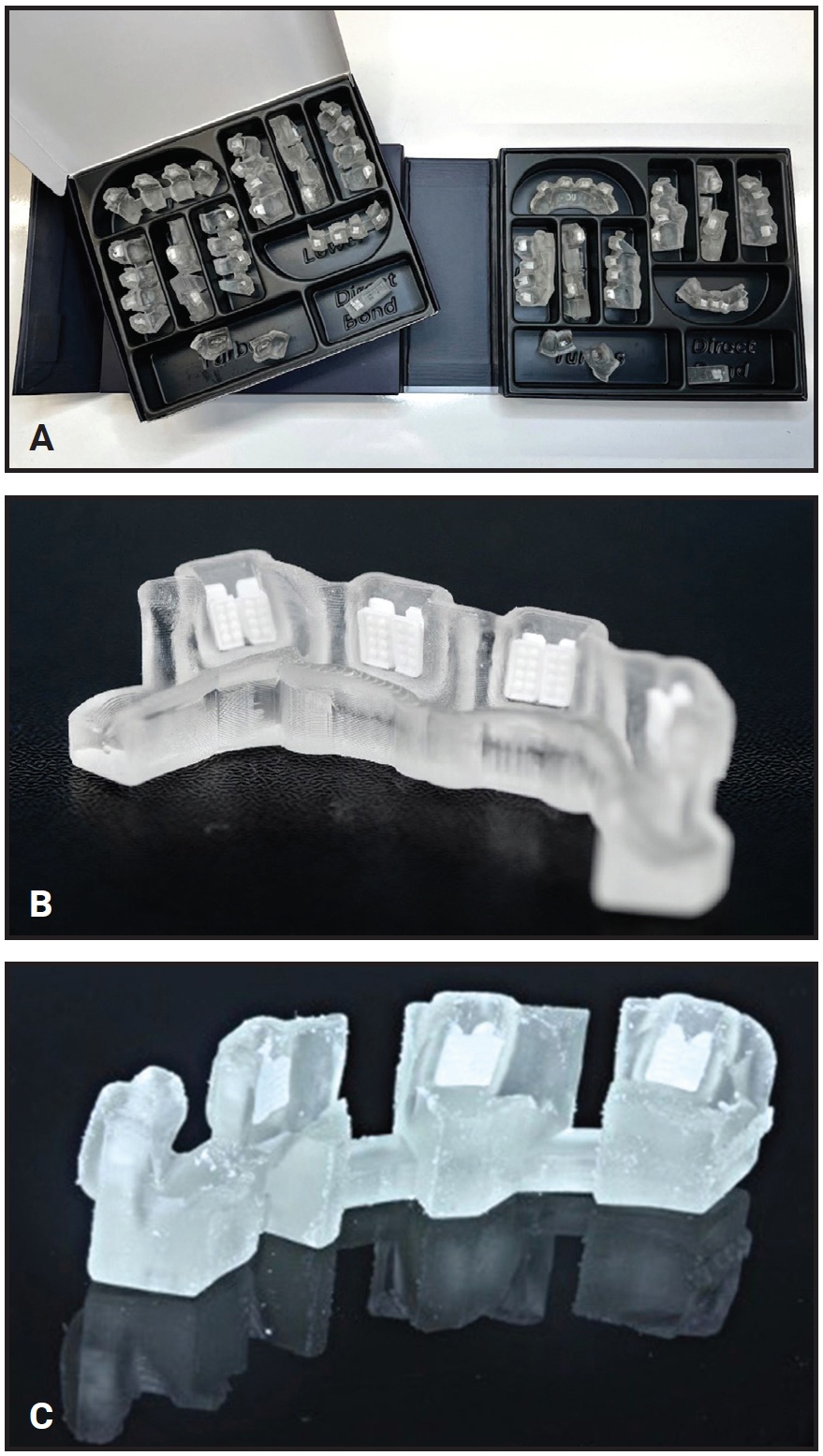 Fig. 4 A. Right: initial indirect bonding trays; left: single-tooth rebonding jigs. B. Close-up of indirect bonding tray sextant. C. Rebonding jigs, arranged in sextants, can be individually separated from their connections to precisely replace individual brackets at any point in treatment.