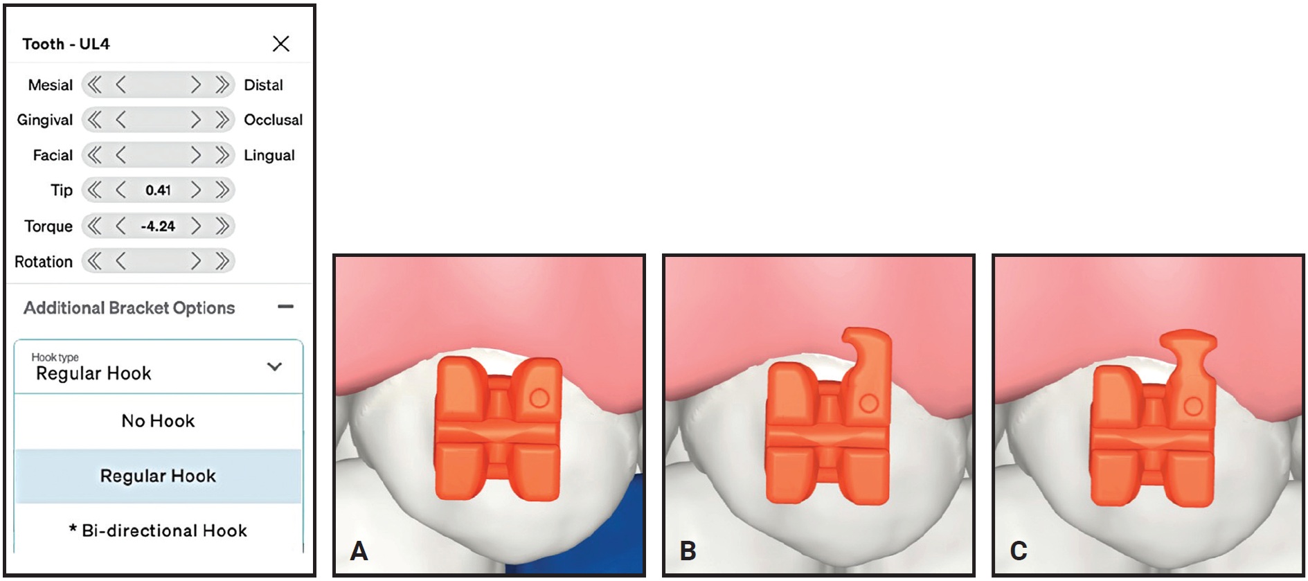 Fig. 5 Customizable LightPlan options for upper left first premolar include no hook (A), unidirectional hook (B), and bidirectional hook (C).