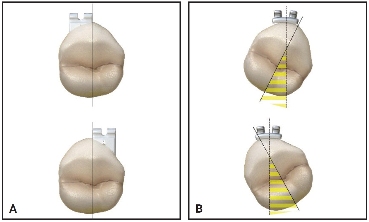 Fig. 7 A. LightForce custom base enables bracket placement on any portion of buccal surface. B. Same placement of standard bracket causes rotation.