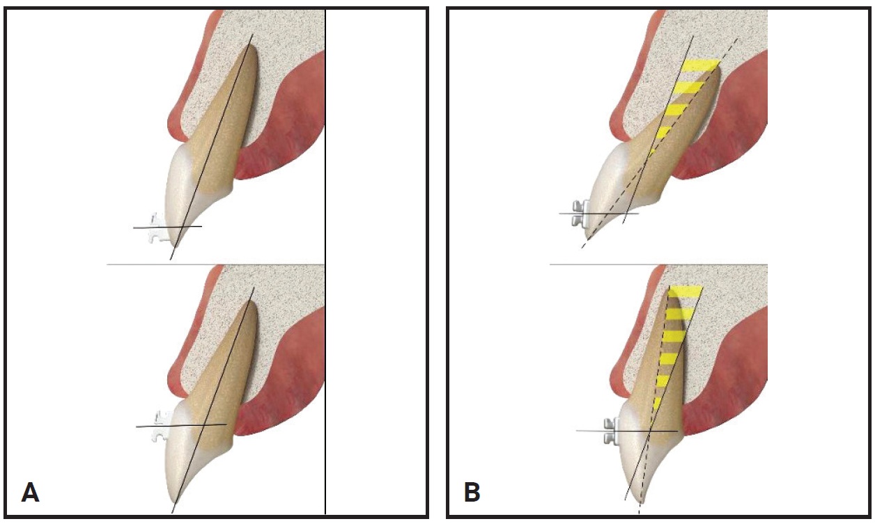 Fig. 8 A. LightForce bracket base adapts to maintain torque, independent of vertical position. B. Same positioning of standard bracket alters torque expression.