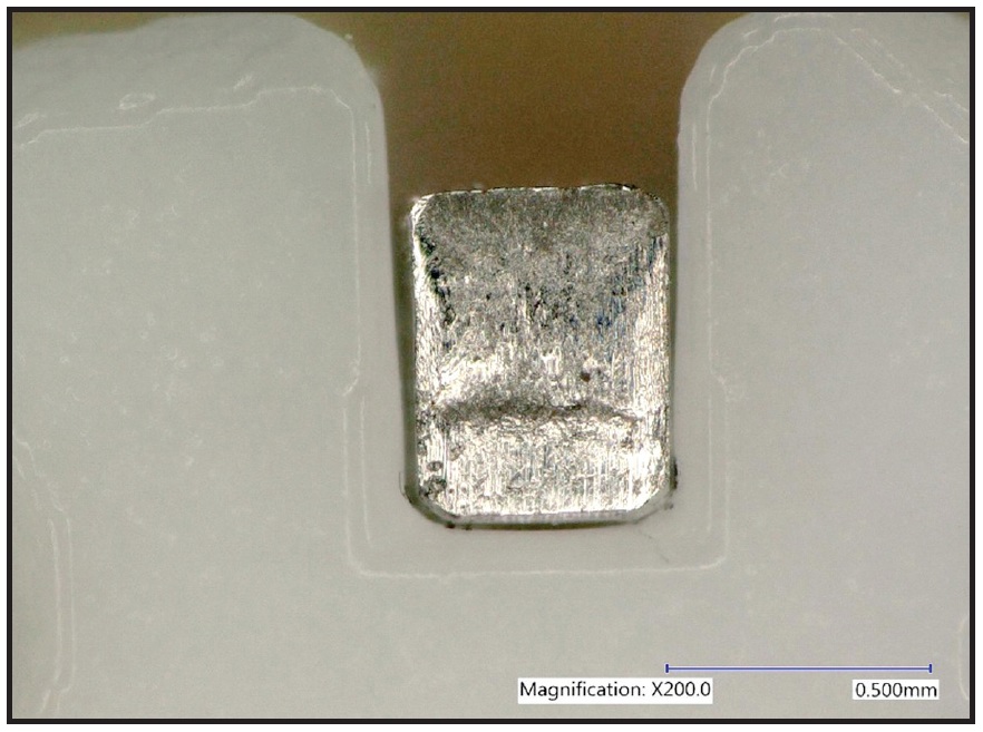 Fig. 9 200× magnification of .019" × .025" stainless steel archwire in .020" LightForce slot. 3D printing ensures parallel slot walls and accurate dimensions.