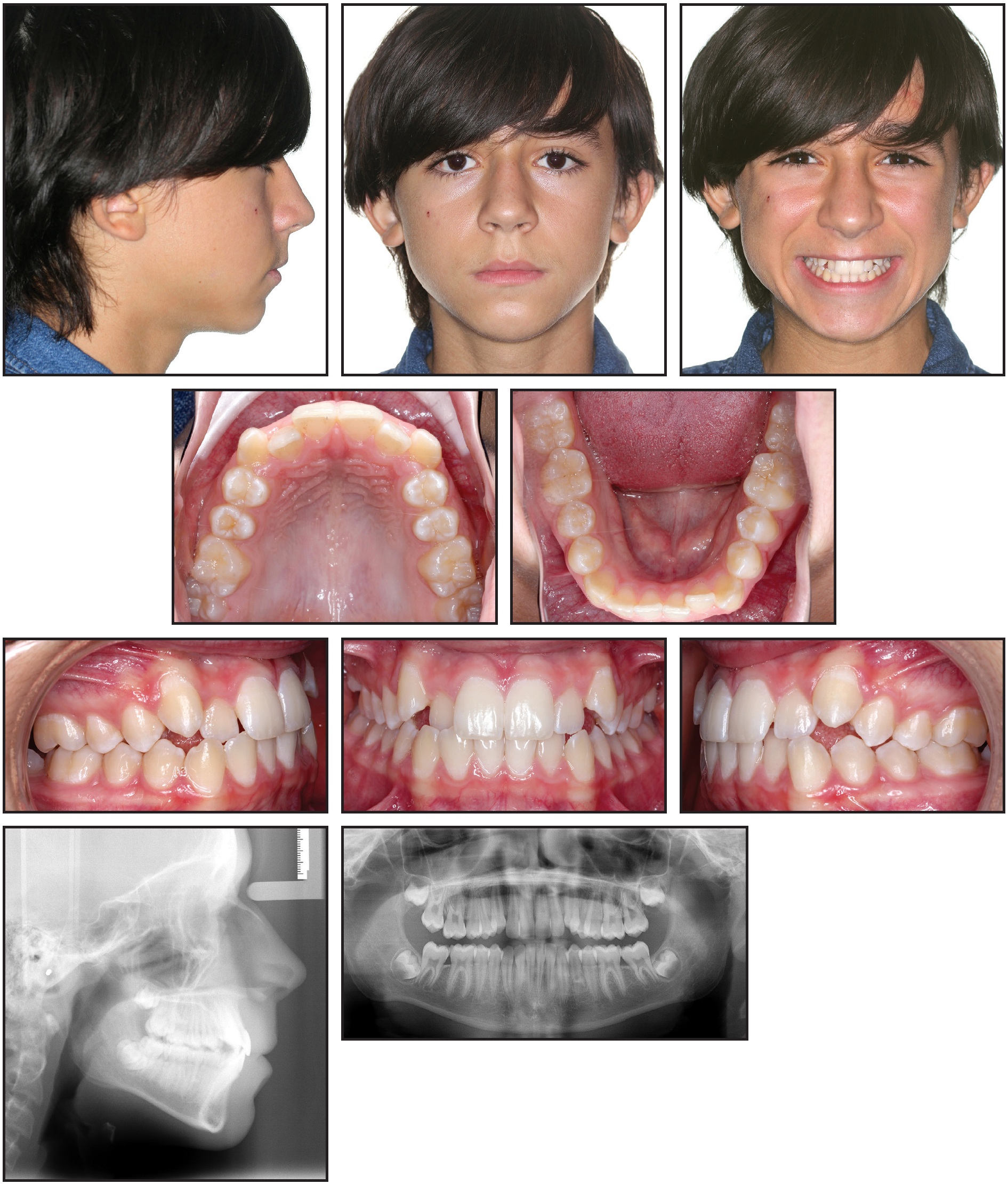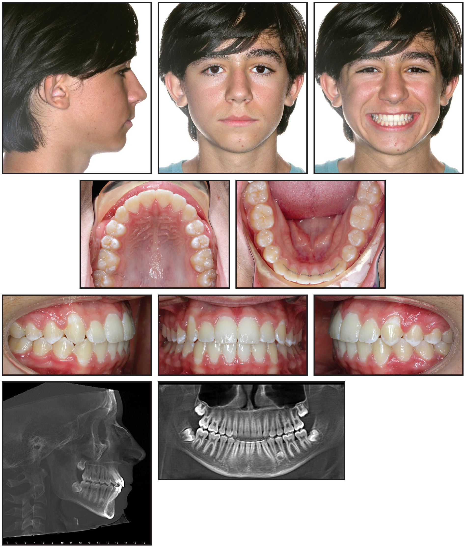 A 13-year-old male presented with the chief complaint of crowding. He had a Class I occlusion with a slightly hyperdivergent skeletal pattern and mild proclination of the lower incisors (Fig. 11, Table 1). Anterior crowding was present in both arches, and the maxillary lateral incisors were palatally displaced. The upper right lateral incisor was in crossbite with the lower right lateral incisor and canine.