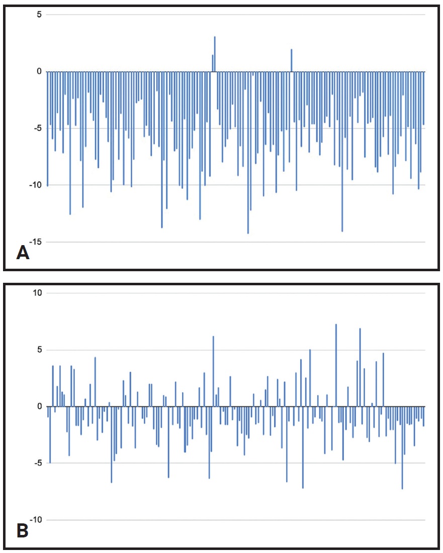 Fig. 1 Programmed variations in torque for upper right first premolar (A) and lower right central incisor (B) in 166 consecutive LightForce* cases treated by one doctor.