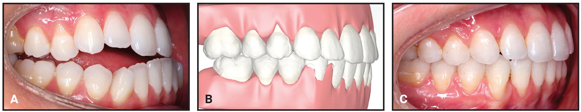 Fig. 2 Typical surgical-orthognathic case, with positive torque added to lower incisors to establish ideal final angulation and occlusion. A. Before treatment. B. LightPlan* setup with “surgical jump.” C. Final result after 20 months of combined orthodontic and surgical treatment.