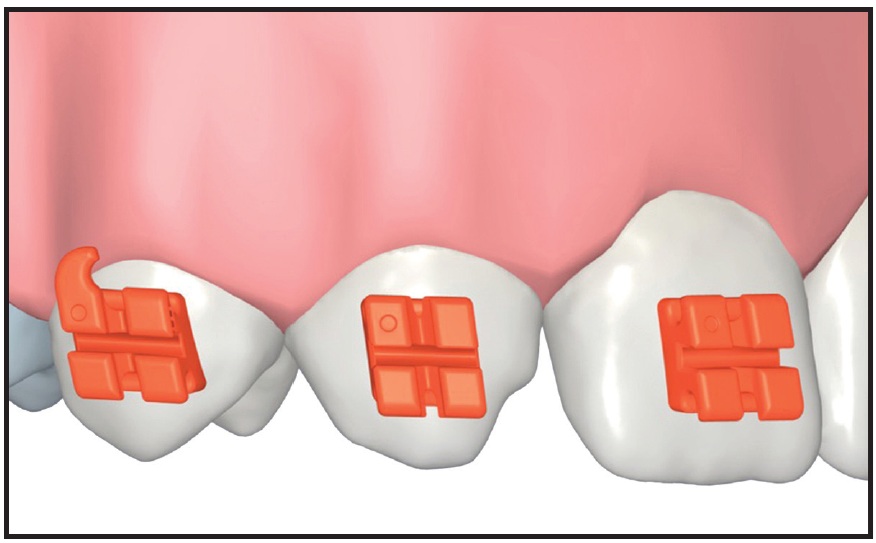 Another example of the advantages of full customization is seen in a patient with a missing maxillary lateral incisor being treated with canine substitution (Fig. 3). In this clinical scenario, the orthodontist can program the ideal position of the canine in LightPlan, and a custom bracket will be designed and 3D-printed to achieve that goal without the need for alternative analog approaches, such as bracket substitution, to achieve the correct torque.