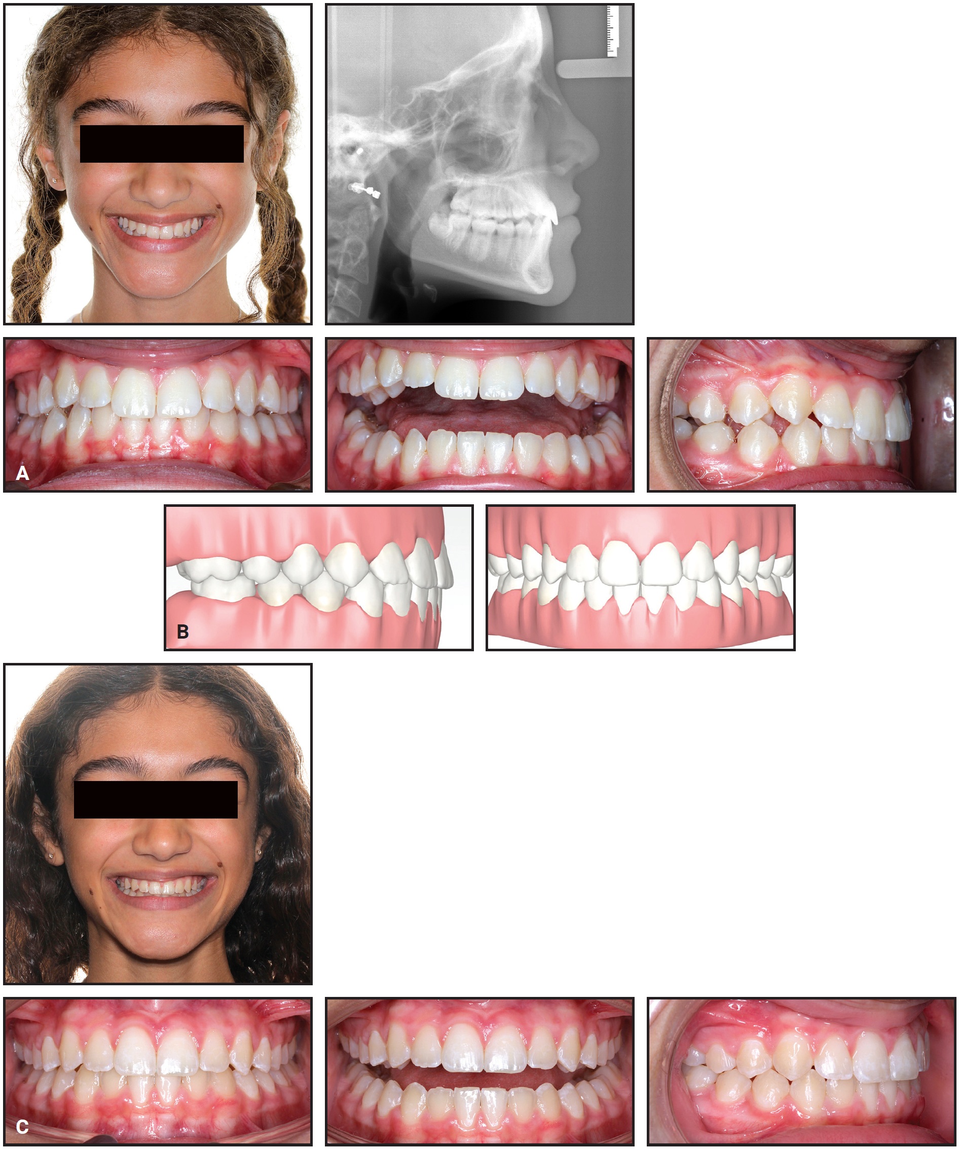 Fig. 5 A. 13-year-old female patient with buccally inclined maxillary premolar crowns and acceptable maxillary incisor torque before treatment. B. LightPlan setup showing correction of maxillary posterior torque and maintenance of anterior torque. C. Patient after 11 months of treatment.