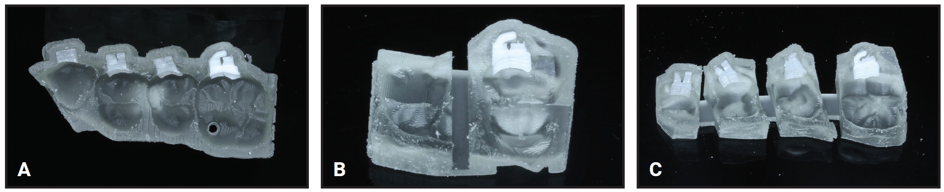 Fig. 7 A. Indirect bonding tray sextant. B. Specialized indirect bonding tray for second molars. C. “Tree” of individual rebonding jigs, easily separated for individual application.