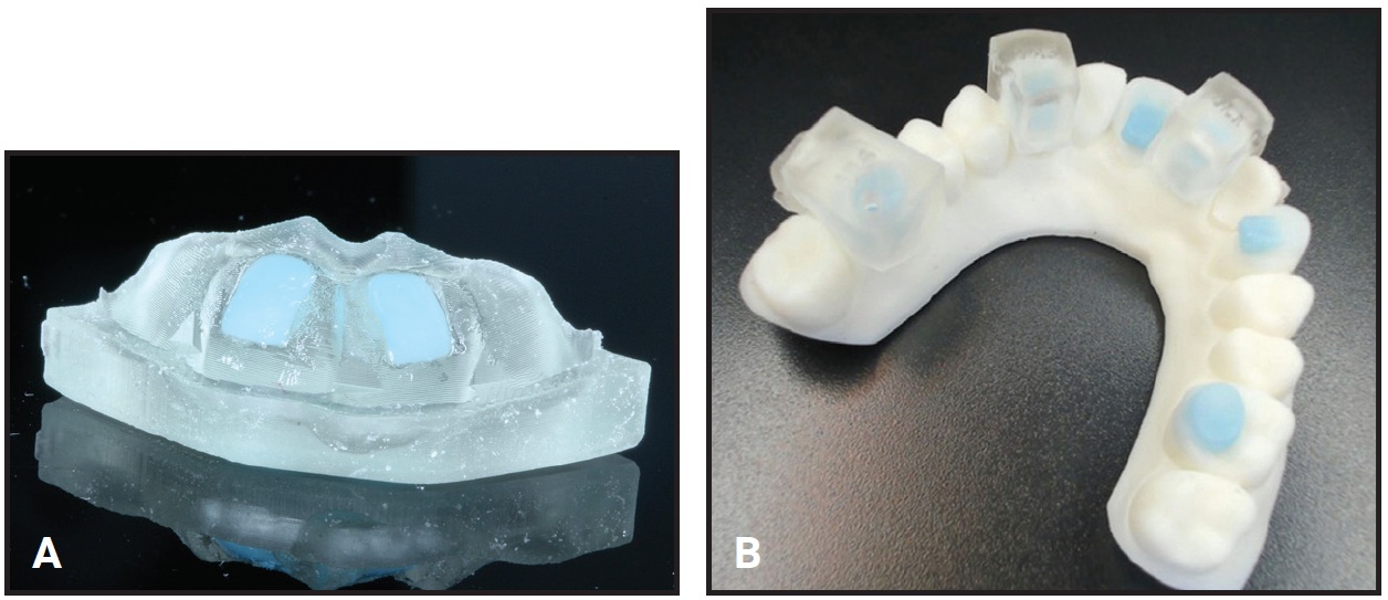 Fig. 8 A. Bite turbo tray for upper central incisors, filled with blue composite. B. Model showing some bite-turbo options: central incisors, canines, and first molars (also available for premolars and second molars). Individual bracket rebonding jigs are digitally designed to fit over bite turbos.