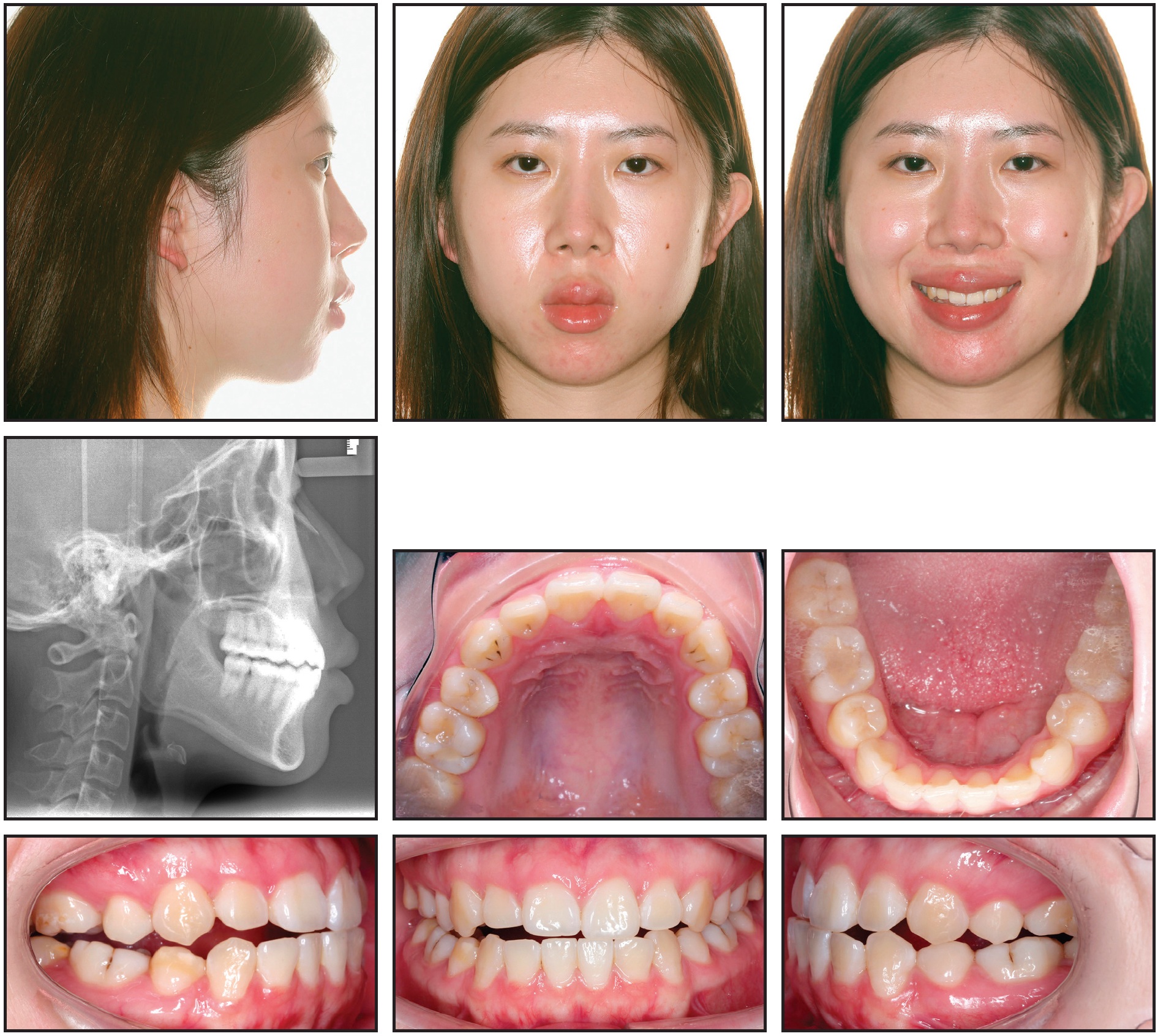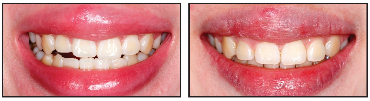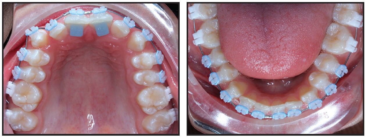 Final archwires were upper .019" × .025" G4** nickel titanium and lower .018" × .025" Smart Arch.*** Vertical elastics were worn from the upper canines to the lower canines and first premolars for the last four weeks of treatment.