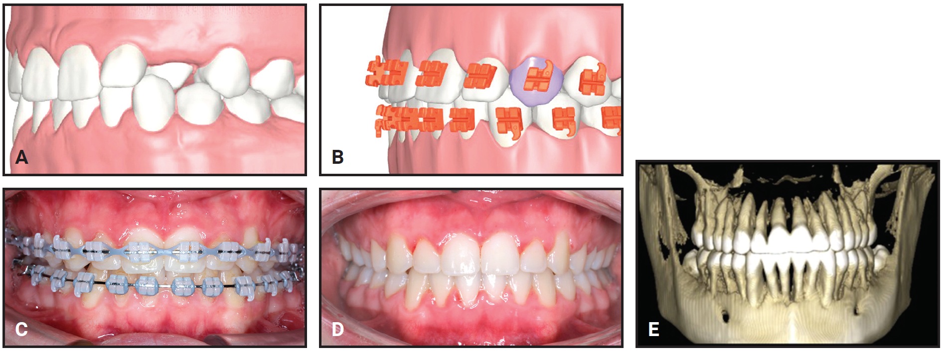 Fig. 10 Clinical example of mirroring feature in LightPlan. A. Insufficient tooth structure available to create bracket for palatally displaced upper left canine. B. Custom bracket created for upper left canine as mirror image of upper right canine. C. Progress after 16 months of treatment. D. After 19 months of treatment. E. Final ultra-low-dose cone-beam computed tomography (CBCT) confirming torque symmetry of upper canines and efficacy of mirroring technology.
