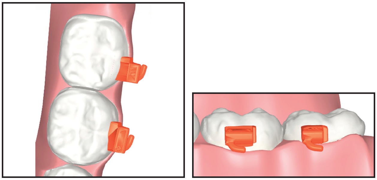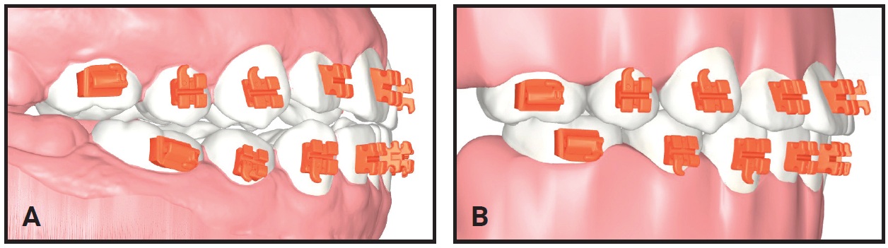 Initial indirect bonding trays are arranged in sextants for ease of clinical management (Fig. 7A). Separate individual jigs are provided for indirect bonding of the second molars (Fig. 7B). A mesial extension of the second-molar tray to the first molar provides stability during bonding, but can easily be removed by breaking it along the seam between the first and second molars. This unique feature adds clinical flexibility in terms of scheduling: if the second molars are to be bonded at a subsequent visit, the mesial extensions should be removed to allow movement of the first molars. Each case comes with a set of backup brackets that are preloaded into individual jigs for accurate rebonding of loose brackets at any stage of treatment (Fig. 7C). These are connected in sextant “trees” and removed individually as needed.