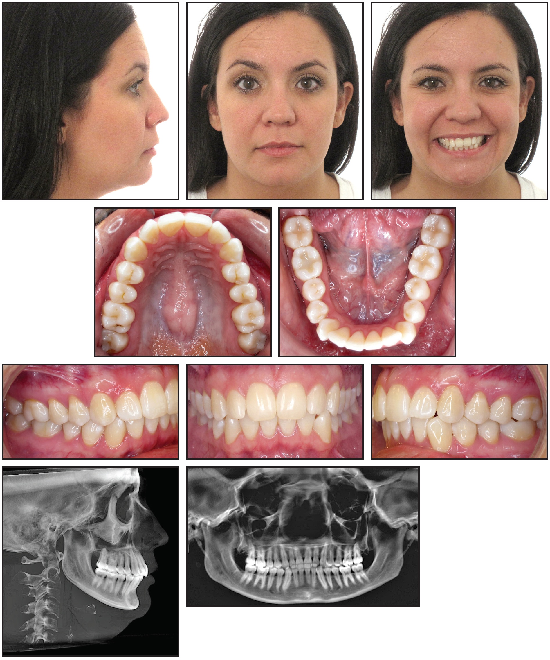 Cephalometric analysis indicated a Class II skeletal relationship, due to a slightly retrognathic mandible, and a steep mandibular plane. The panoramic radiograph showed parallel roots, previously extracted third molars, and a short ramus on the left side. The right TMJ evidenced remodeling with a posterosuperior loss of volume, thin joint space, posteriorly positioned condyle, and flattened eminence. The left TMJ exhibited inactive degenerative joint disease with a posterosuperior loss of volume, thin joint space, posteriorly positioned and small condyle, flattened eminence, and anterior osteophyte.