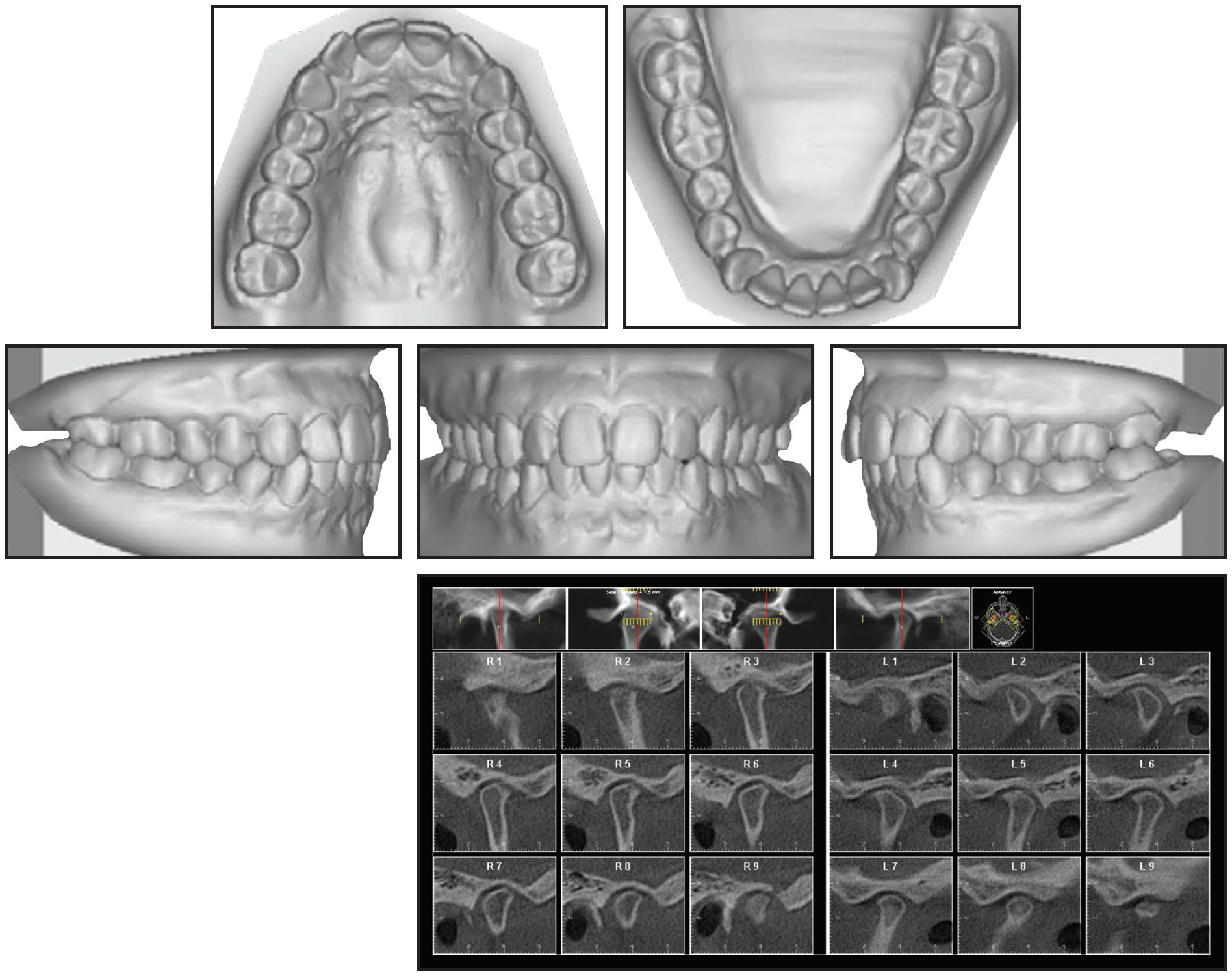 The treatment objectives were to resolve the TMD (clicking and instability) and the posteriorly displaced condyles, relieve the pain and muscle soreness, eliminate the dental crowding, and maintain a Class I occlusion while correcting the Bolton discrepancy.
