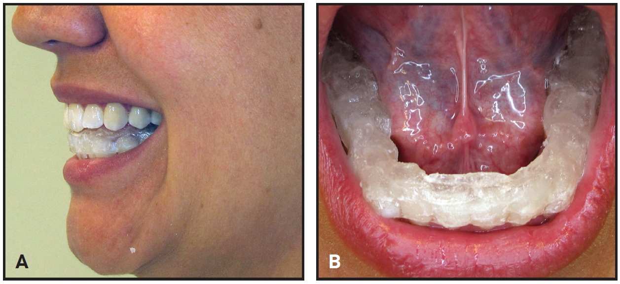 An anterior repositioning appliance allows healing of the retrodiscal tissues, redistributes forces within the complex, and promotes condylar remodeling.6 Practitioners have used such appliances for treatment of anterior displacement with or without reduction, tension headaches,7 and a variety of intracapsular issues.8 Grummons recommended beginning TMD treatment with an anterior repositioning appliance because it can help resolve joint clicking, locking, stiffness, and inflammation.9 Since pain within the TMJ complex cannot be differentiated among intracapsular disorders, the anterior repositioning appliance is a logical place to start.10