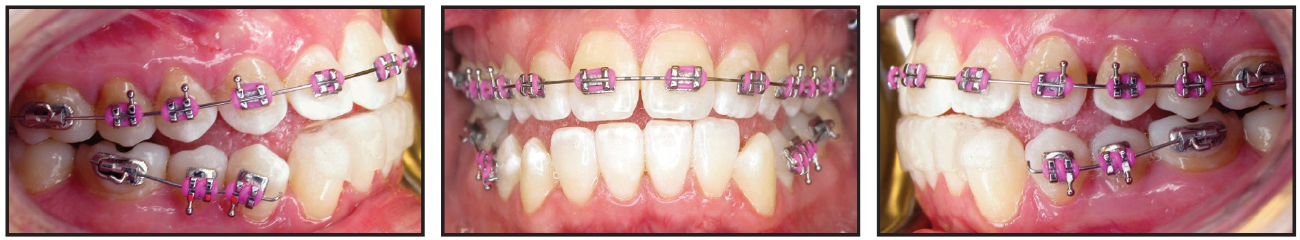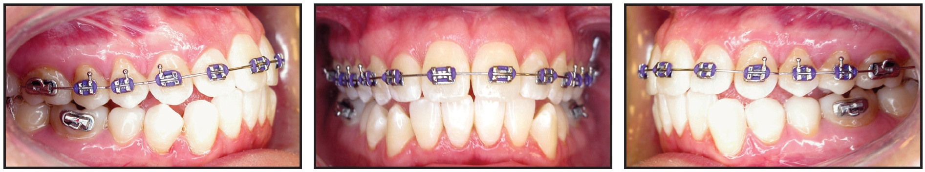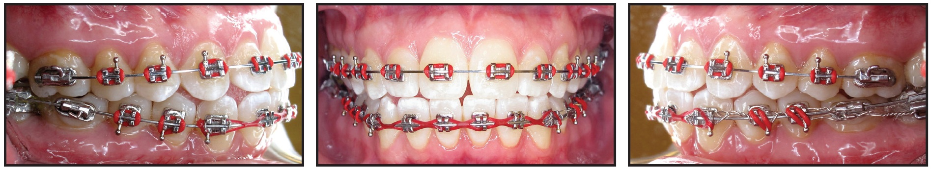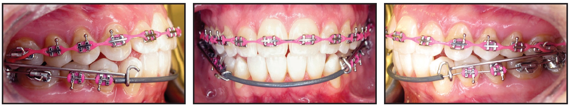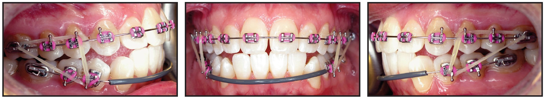 After eight weeks of pain-free splint wear, we initiated orthodontic treatment. In a TMD patient, there is always a concern when posterior forces are exerted on the mandibular structure. Hu and colleagues, evaluating the effects of Class III interarch elastics, demonstrated that the condyloid rotated counterclockwise, with an overall displacement posteriorly and superiorly.19 Because shorter Class II and III elastics were found to be gentler, our vertical Class III elastics were configured to provide a short-elastic effect. Forces were controlled by progressively equilibrating the splint and removing material to reestablish the bite. The mandibular complex was maintained in centric relation, ensuring dentoalveolar movement rather than movement of the entire TMJ complex.