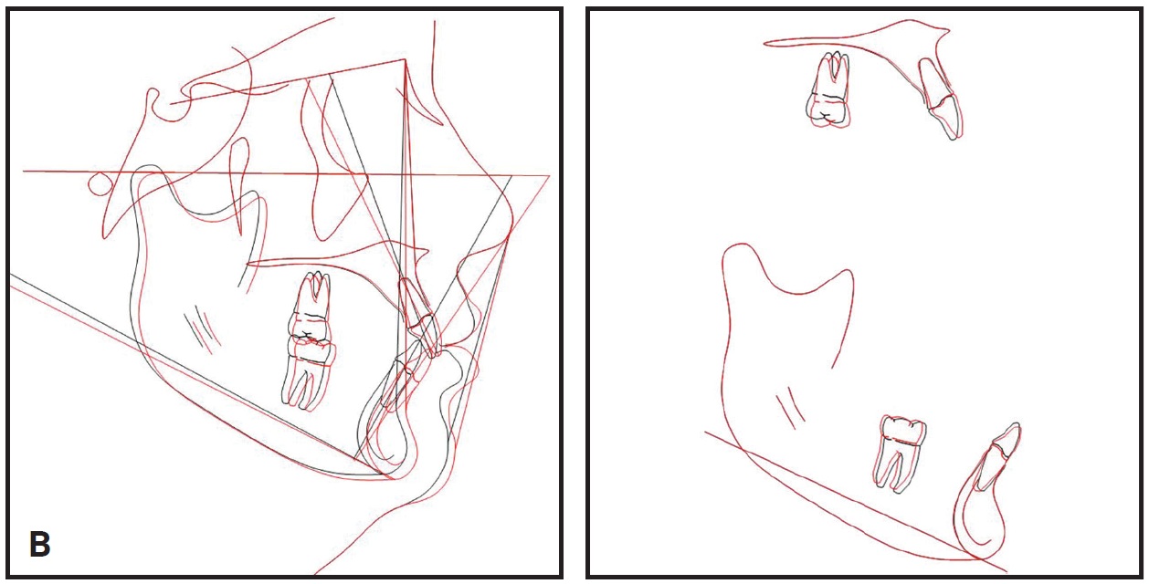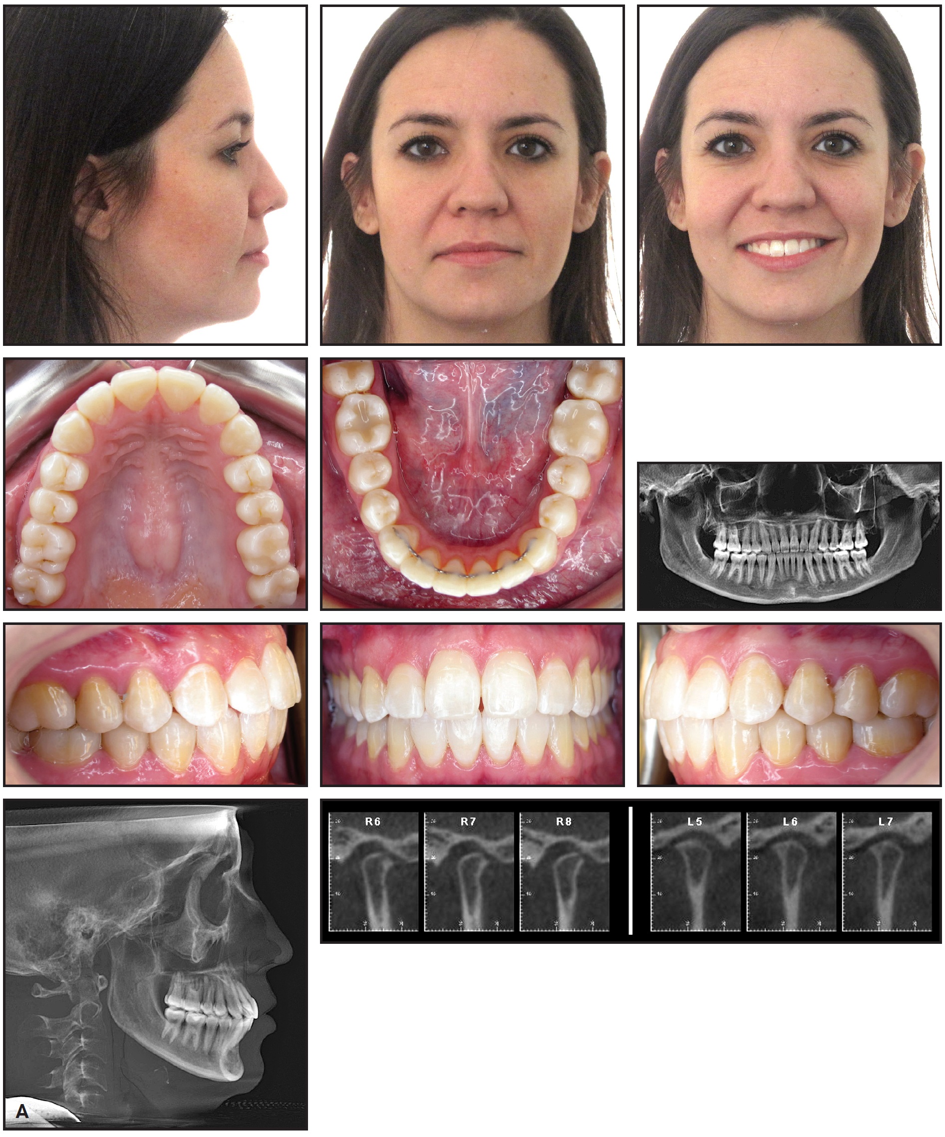 Total treatment time was 21 months (Fig. 10A). A normal overbite and overjet were established, while the Class I occlusion was maintained. The midlines were coincident, and a straighter profile was achieved. The patient showed slightly increased incisal angulations, proper root angulations, and normalized condylar positions with no further condylar remodeling. Cephalometric superimpositions indicated flaring of the upper and lower incisors and some mandibular protrusion (Fig. 10B).