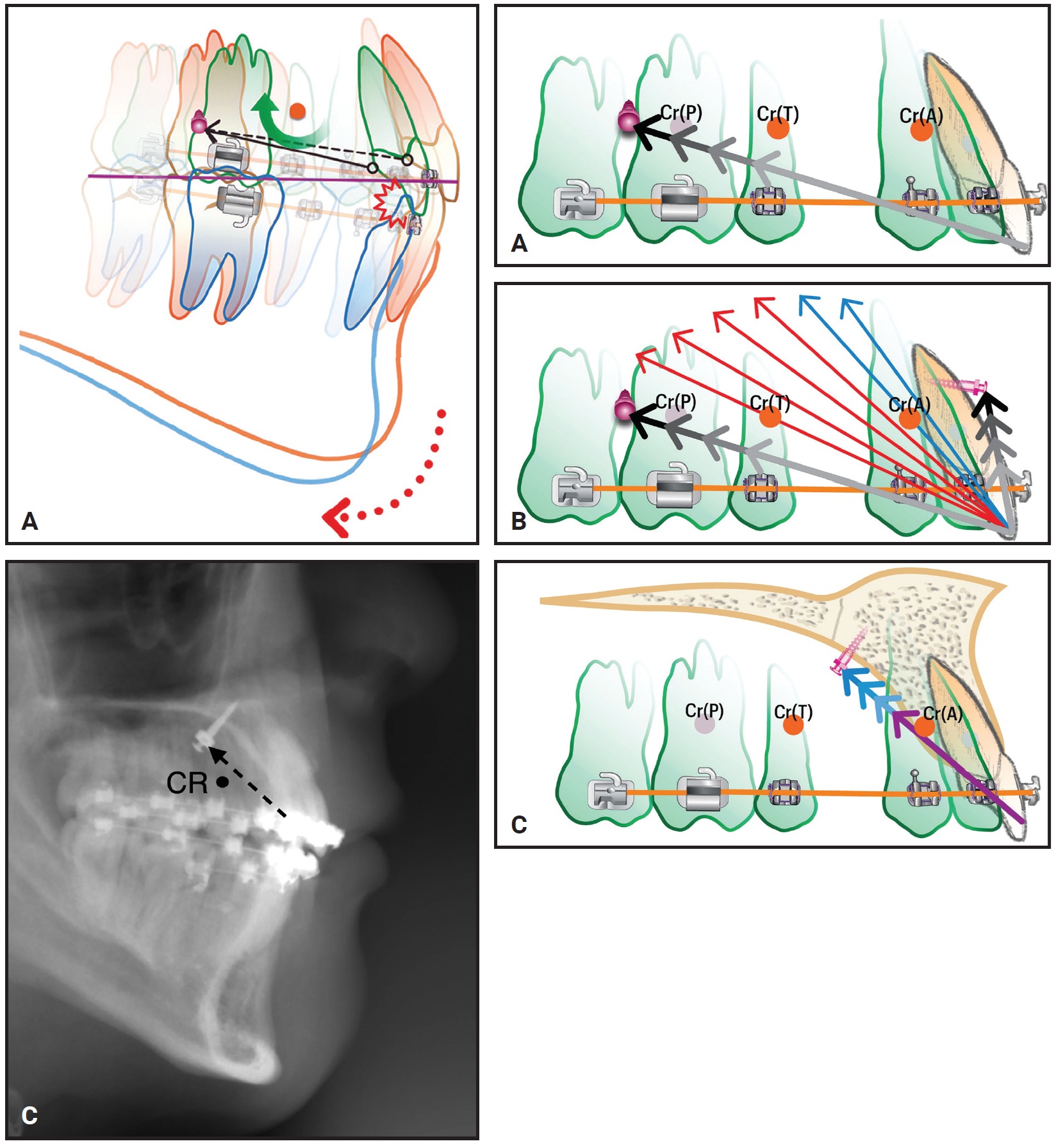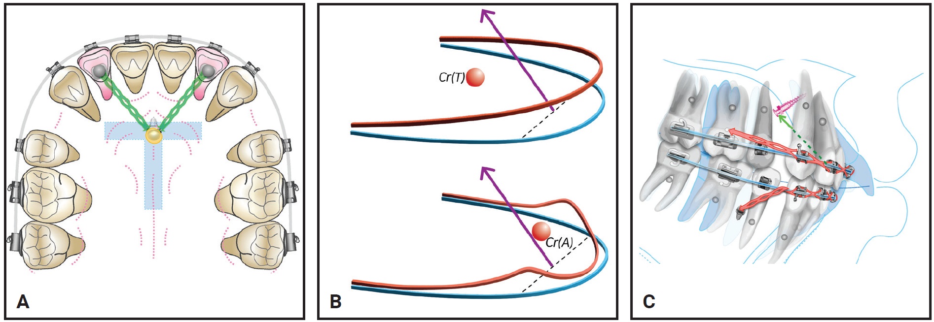 Fig. 1 High-pull palatal gear (HPPG) technique. A. Palatal miniscrew inserted in anterior portion of T-Zone and connected with elastomeric chains to lingual buttons on lateral incisors. B. Retracting lateral incisors on rigid archwire (above) transmits intrusion force to entire dentition; soft archwire (below) demonstrates side effects of force system (Cr(A) = center of resistance of anterior segment, Cr(T) = center of resistance of total arch). C. HPPG technique, with bilateral miniscrews inserted between lower first premolars and first molars, used for intrusion of both upper and lower dentitions.