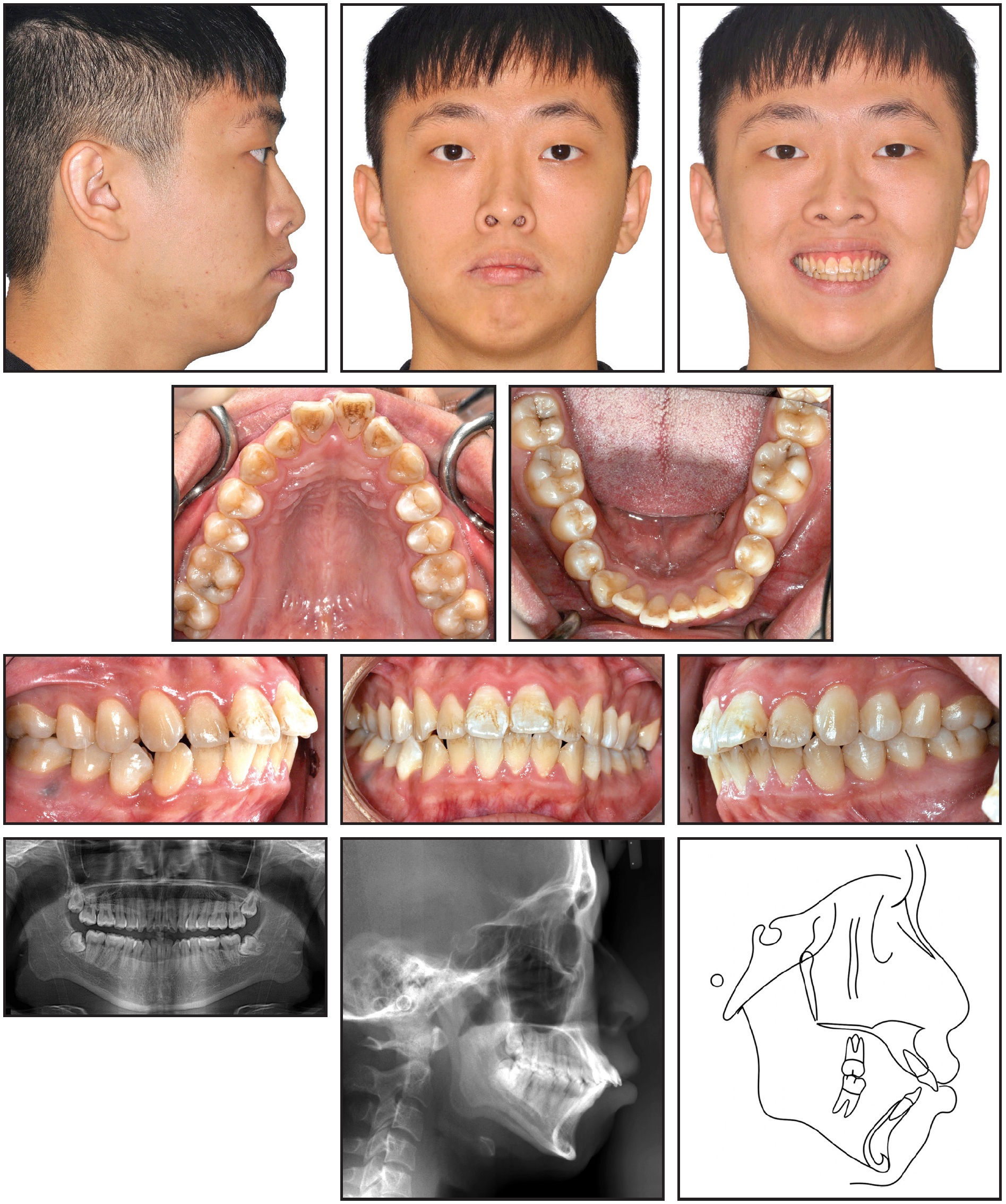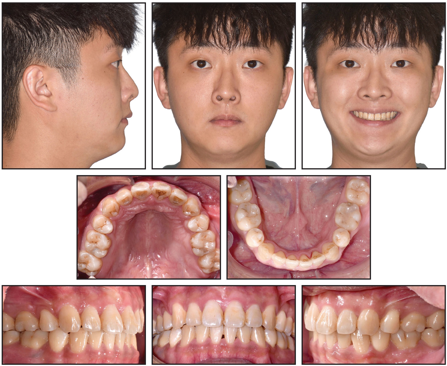 A 25-year-old male presented with the chief complaints of perioral protrusion and a gummy smile. Clinical examination showed a convex profile with a retrusive mandible and a long lower face, along with protrusive lips and an acute nasolabial angle (Fig. 2). The patient’s excessive gingival display in smiling and pronounced mentalis strain upon lip closure indicated significant vertical disharmony. A slight facial asymmetry was noted, with the maxillary dental midline deviated 1mm to the right of the facial midline and the mandibular midline 1mm to the right of the maxillary midline. The chin was also deviated 1.5mm to the right of the facial midline. A Class II canine relationship was present on the right side and a Class I canine relationship on the left, with bilateral Class I molar relationships. The overjet was 4mm, and the overbite was 2mm.