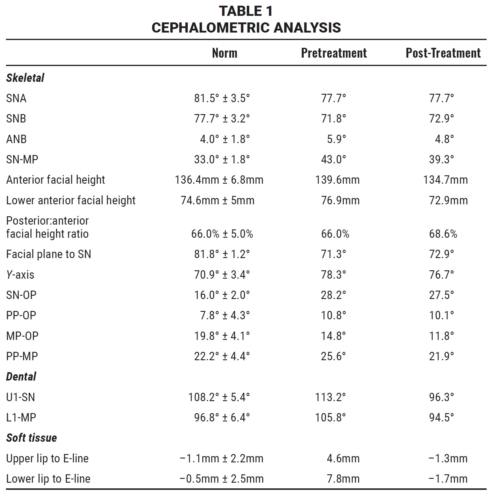 The panoramic radiograph revealed the impaction of all four third molars. The patient’s overall periodontal status was fair. Cephalometric analysis (Table 1) indicated a skeletal Class II malocclusion (SNA = 77.7°, SNB = 71.8°, ANB = 5.9°) with a high mandibular plane angle (SN-MP = 43°). The upper and lower incisors were proclined (U1-SN = 113.2°, L1-MP = 105.8°).