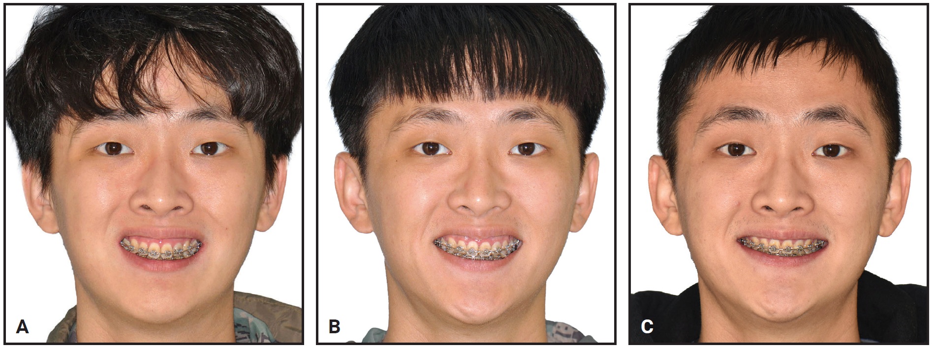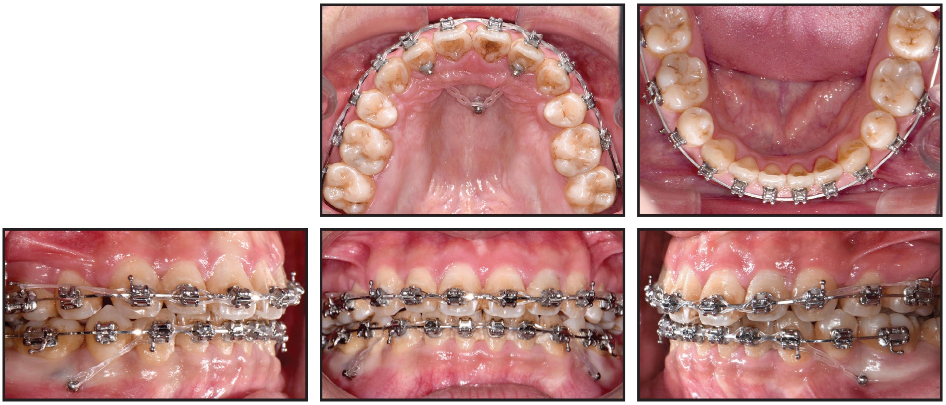 After seven months of active treatment, a 1.5mm × 8mm midpalatal miniscrew** was inserted, and elastomeric chains were attached from the screw to lingual buttons bonded to the upper lateral incisors. Because the lateral incisors are near the center of resistance of the anterior segment, proper torque control and efficient intrusion of the upper anterior segment could be achieved during closure of the extraction spaces. The rate of space closure in each arch was coordinated to avoid producing anterior interferences. Over the course of treatment, a gradual improvement was observed in the gummy smile (Fig. 3).