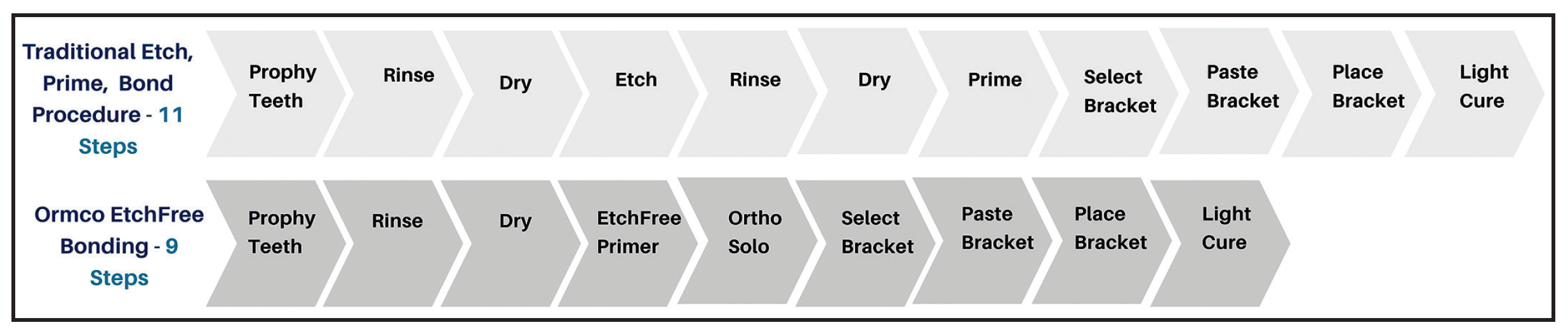 Fig. 1 Comparison of 11-step conventional etching and bonding process and nine-step Ormco EtchFree Bonding* system.