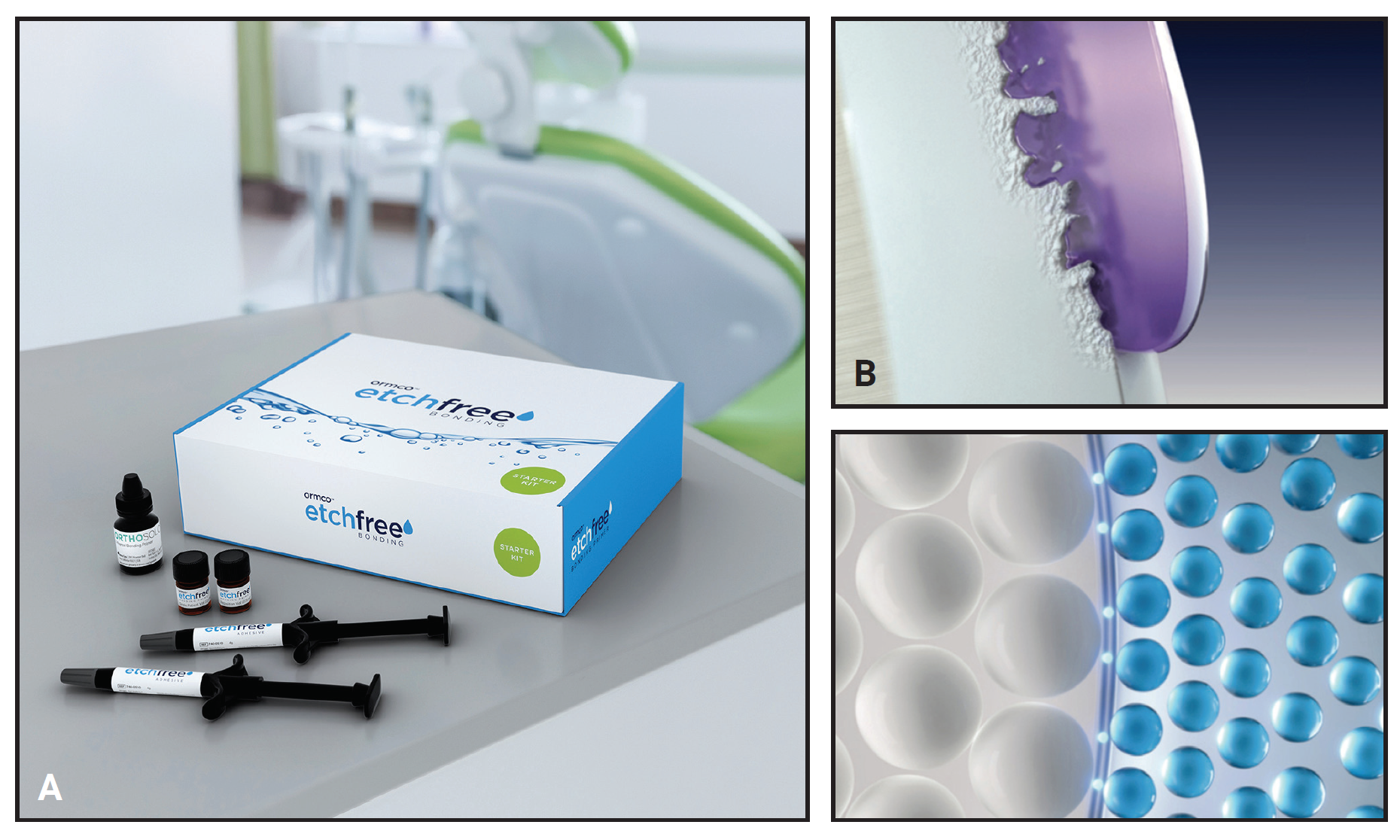 Fig. 2 A. Ormco EtchFree Bonding* kit, including EtchFree Bonding Primer,* Ortho Solo* bond enhancer, and EtchFree Adhesive.* B. Conventional priming etches enamel (top); EtchFree Bonding Primer forms ionic bonds with calcium in hydroxyapatite (bottom).