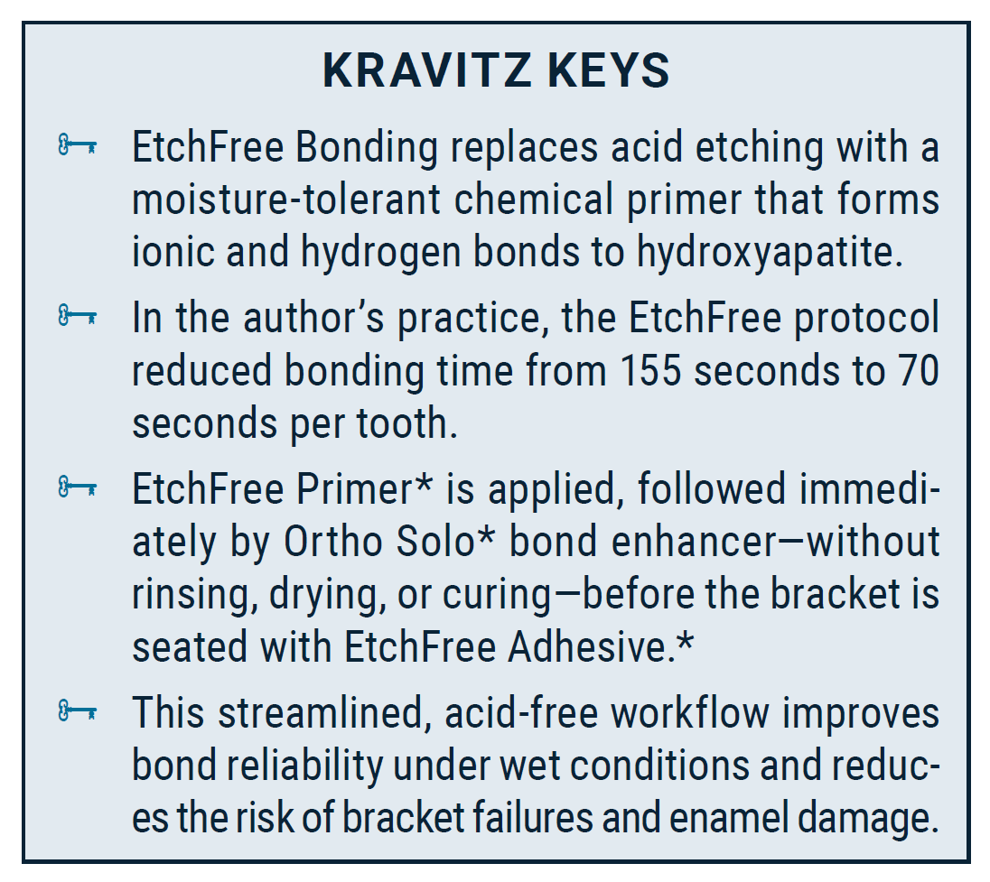 By reducing the time and number of steps required to prepare teeth for direct bonding, the EtchFree Bonding system can be particularly beneficial for practices with varying staff experience levels or high turnover, potentially reducing mistakes and thus producing more reliable outcomes. One limitation of the system is that it restricts the choice of adhesive, since EtchFree Bonding Primer can currently be used only with Ortho Solo and EtchFree Adhesive. In addition, the lack of a fluorescent marker may complicate adhesive removal. Nevertheless, the reduced chairtime, ample clinical bond strength in the presence of moisture, and diminished risk to enamel health may make the system a practical solution for busy orthodontic practices.