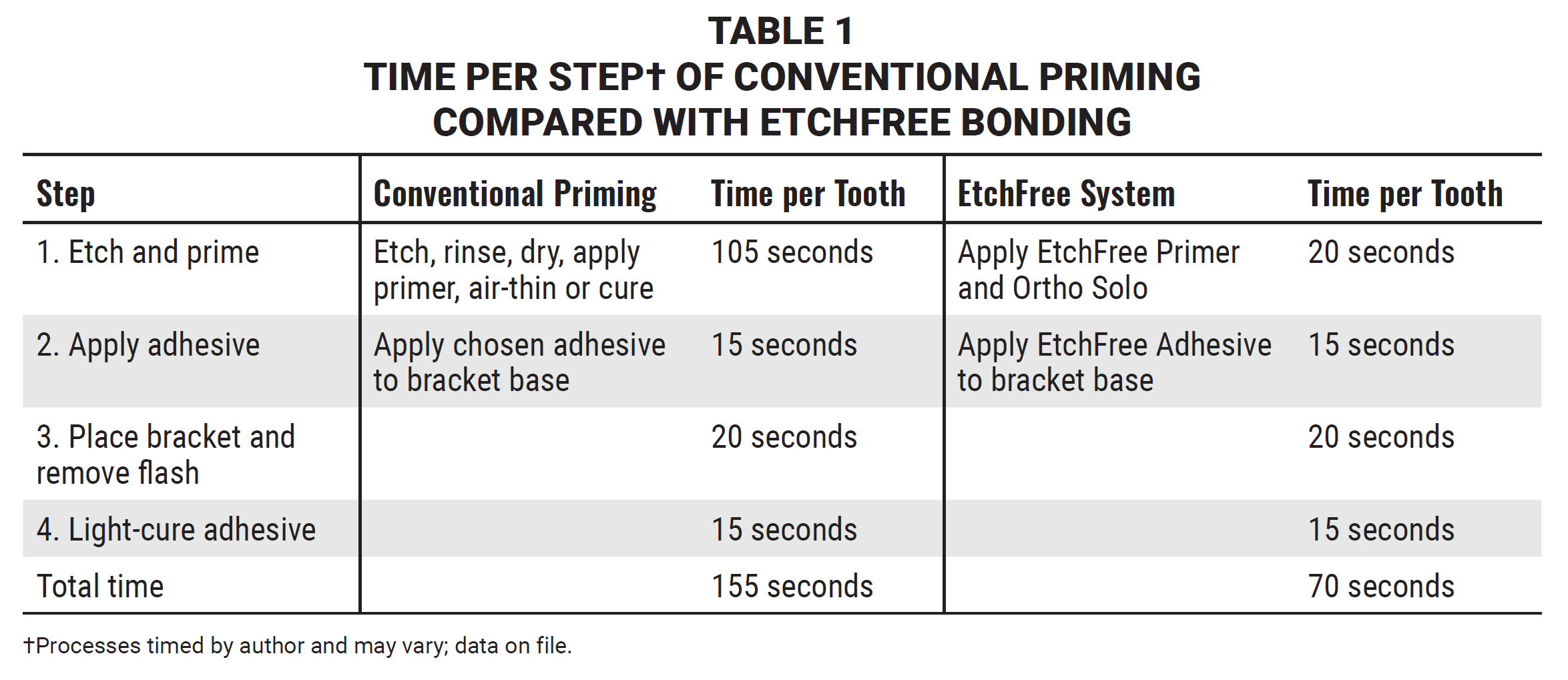 Eliminating the etching step from the workflow substantially reduces bonding time. To time the EtchFree Bonding procedure, my practice prepared 25 arches for bonding with the EtchFree Bonding system and compared them to a control prepared with conventional acid etching (Table 1). When measuring the time elapsed for bonding a single tooth, EtchFree Bonding took a mean 70 seconds, whereas the traditional etch-and-rinse process took 155 seconds per tooth. The difference is attributable to the initial steps: applying EtchFree primer and Ortho Solo, without rinsing or curing, takes 20 seconds on average, while the equivalent steps of the etch-and-prime workflow take 105 seconds. In clinical practice, I have found that using EtchFree saves about three minutes per arch during bonding compared to our previous method.