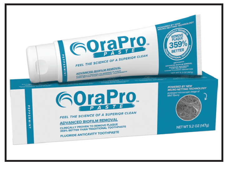 OraCare has introduced OraPro Paste, a new toothpaste sold exclusively to dental professionals. OraPro improves plaque removal with “micro netting technology,” a cellulose microfibril network that entraps difficult-to-remove biofilm. According to the company, OraPro is clinically proven to be more effective than over-the-counter toothpastes, with 359% better plaque reduction, 209% increased fluoride absorption, and less abrasive whitening.