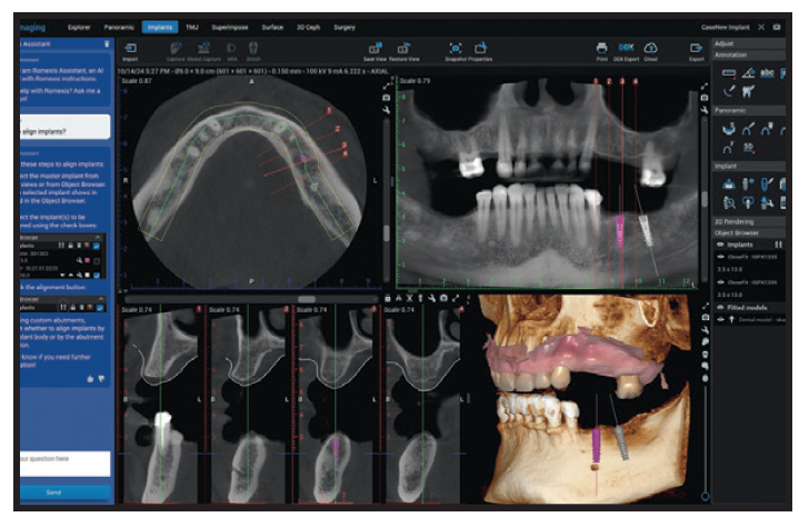 Romexis 7, a new version of Planmeca’s software platform, incorporates built-in AI-powered features. According to the company, integrated AI operates as a smart assistant, automatically handling routine tasks more efficiently. The first release comes with standard, AI-powered three-dimensional imaging tools, such as automatic recognition and segmentation of patient anatomies. Romexis 7 also includes a smart chat function to assist users with software operation.